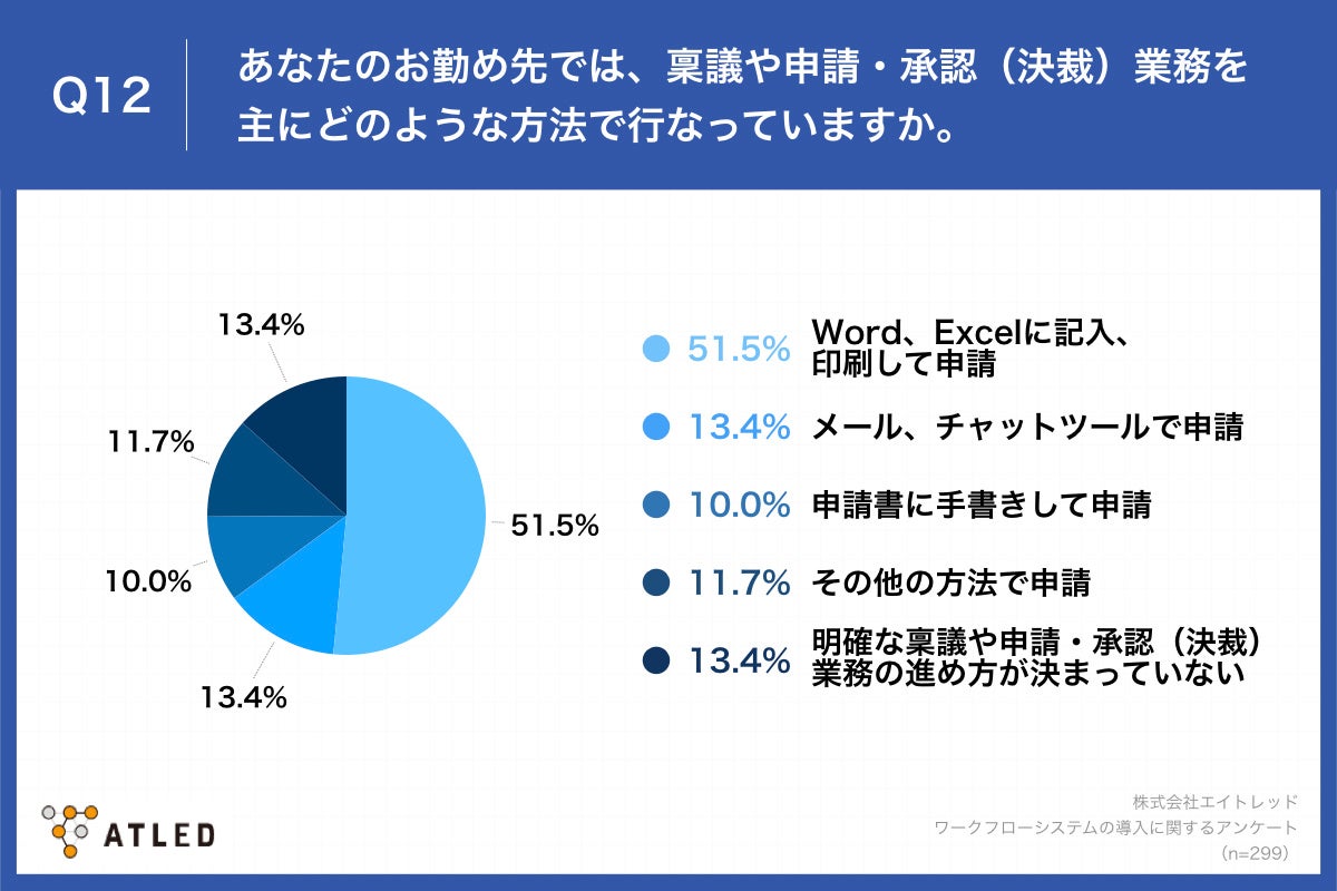 「Q12.あなたのお勤め先では、稟議や申請・承認(決裁)業務を主にどのような方法で行なっていますか。」と質問したところ、「Word、Excelに記入、印刷して申請」が51.5%、「メール、チャットツールで申請」が13.4%という回答となりました。