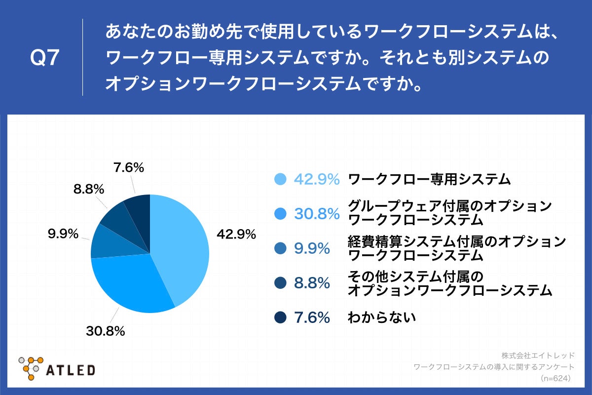 「Q7.あなたのお勤め先で使用しているワークフローシステムは、ワークフロー専用システムですか。それとも別システムのオプションワークフローシステムですか。」と質問したところ、「ワークフロー専用システム」が42.9%、「グループウェア付属のオプションワークフローシステム」が30.8%という回答となりました。