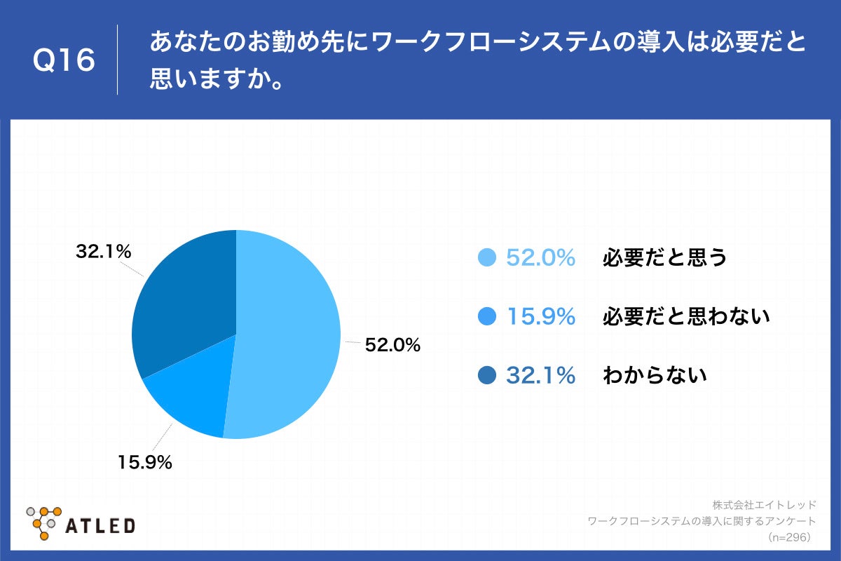 ・未導入企業のうち、63.9%が稟議などになんらかの課題感を感じており(Q13)、さらに52.0%はワークフローシステム導入の必要性を感じている(Q16)