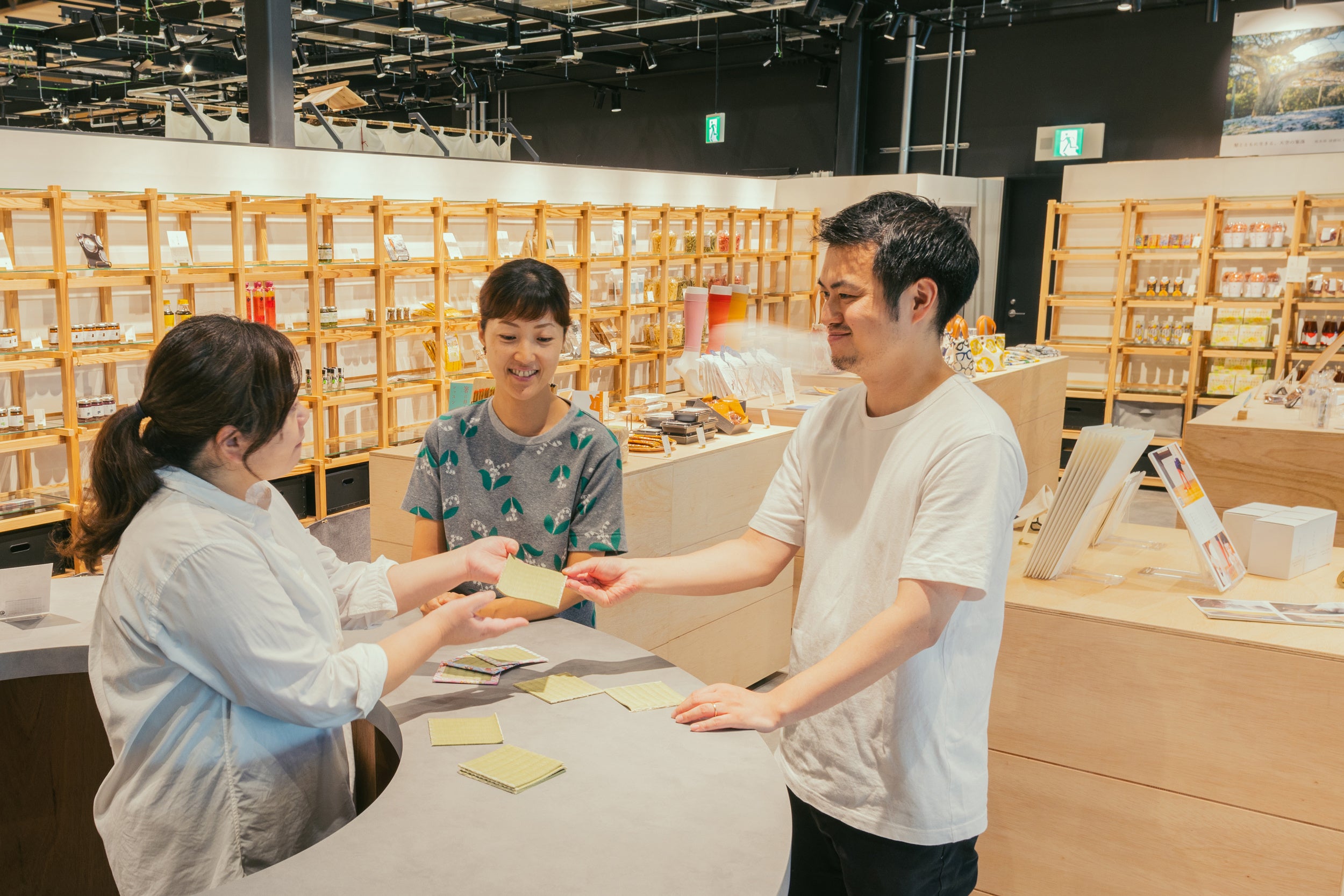 また、単に商品を販売するだけではなく、商品を生産している地域事業者の想いやこだわり等のストーリーを伝えることに注力しているため、地域事業者や商品を深掘りした内容を記載したオリジナルカードを一緒に展示しています。“見て・読んで・触れて楽しめる”。そんなワクワクした買い物ができるエリアになります。