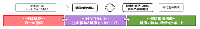 また、本商品では、MYひまわりアプリを中心に健康応援を展開し、お客さまの健康行動と健康の維持・改善をサポートしつつ、ヘルスケアサービスをご利用いただくことにより、重症化の予防やリスクの把握を通してお客さまの健康に寄り添うことで、従来の限定告知型医療保険にはなかった健康応援機能による多様な付加価値を提供します。