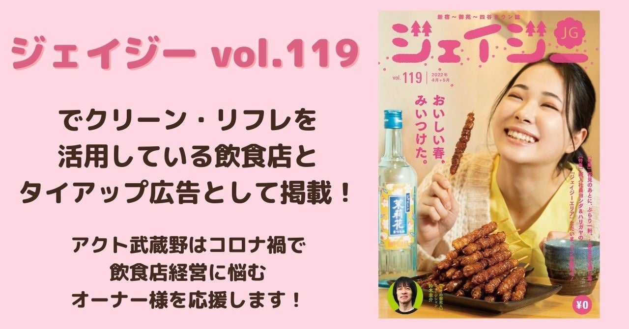 株式会社武蔵野(本社:東京都小金井市、代表取締役社長:小山昇)はコロナ禍で除菌対策に力を入れながら飲食店を営む店舗を応援すべく、新宿~四谷エリアの地域活性化を目的としたフリーペーパー『ジェイジー』に、クリーン・リフレを使用している飲食店様とタイアップ広告として掲載しています。クリーン・リフレを活用して、コロナ禍で飲食店経営に悩むオーナー様を応援します!