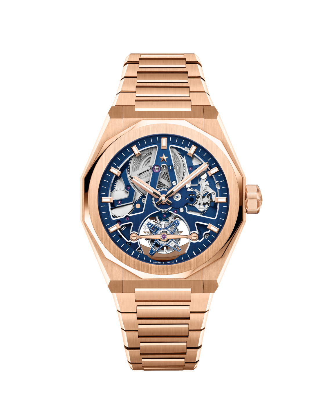 心臓部となる自動巻ムーブメント、エル・プリメロ 3630 SKキャリバーは、力強いルミナスブルーに仕上げられています。スケルトン化する上で、象徴的なゼニススターは構築的なモチーフとなり、拡大されてトゥールビヨンの小窓を囲むように配置されています。キャリバーが生み出す奥行き、仕上げ、カラーのコントラストに躍動感を添えているのが、10時位置と2時位置に置かれた2つの建築的なブリッジです。二層構造で傾斜の付いた形状は動きのあるレリーフとなり、現代建築の線や梁を思わせます。