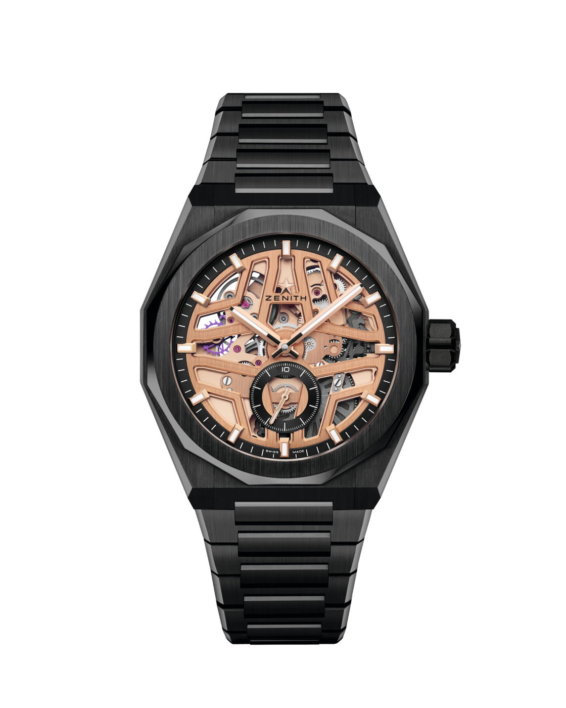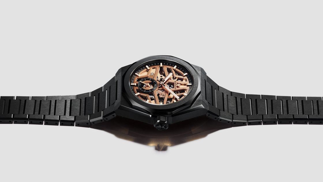 大胆なオープンワーク構造を備える「デファイ スカイライン スケルトン」では、コレクションを象徴する1/10秒表示も含め、エル・プリメロのテクニカルなディテールのすべてを眺めることができます。ディープブラックのセラミックケースとゴールドトーンのムーブメントを組み合わせた新たなコントラストは、現代の都市景観を形づくる光の反射と構造物の陰影を彷彿とさせます。