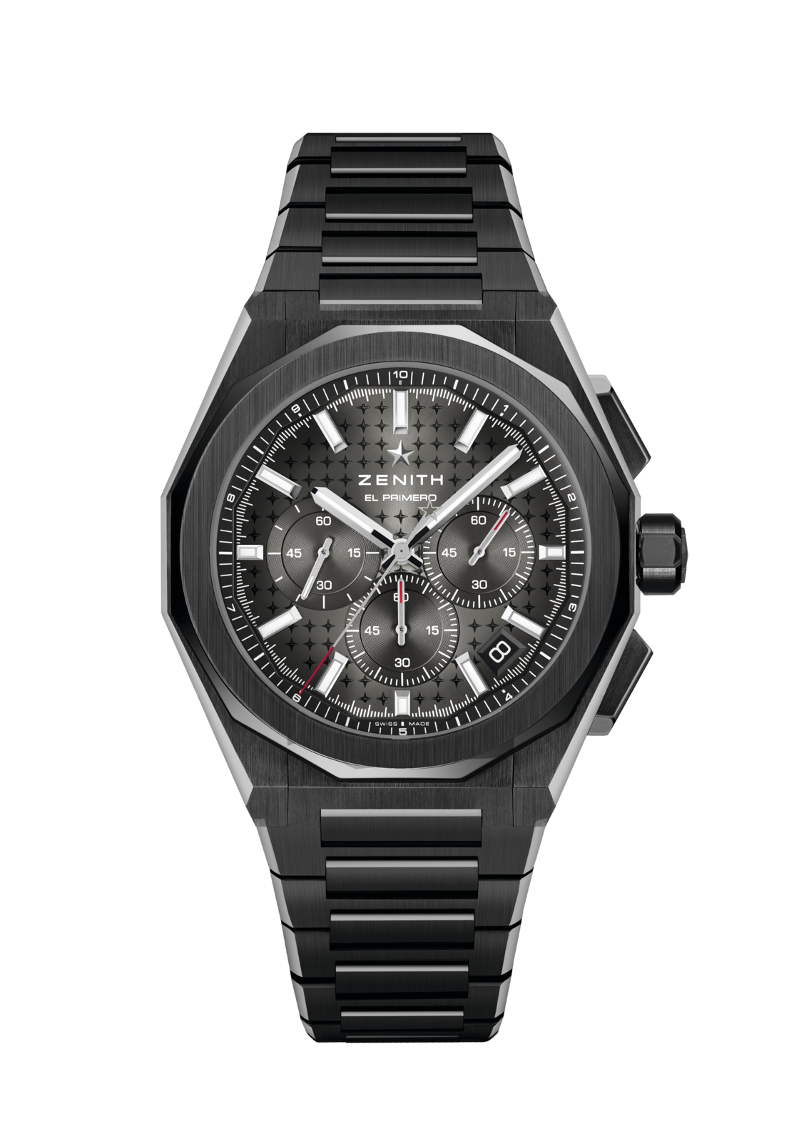 特長:ブラックセラミック製。1/10秒の計測と表示が可能な自動巻エル・プリメロ コラムホイール クロノグラフ。日付表示。シリコン製のアンクルとガンギ車。ねじ込み式リューズ。交換可能なストラップシステム。秒針停止機構。