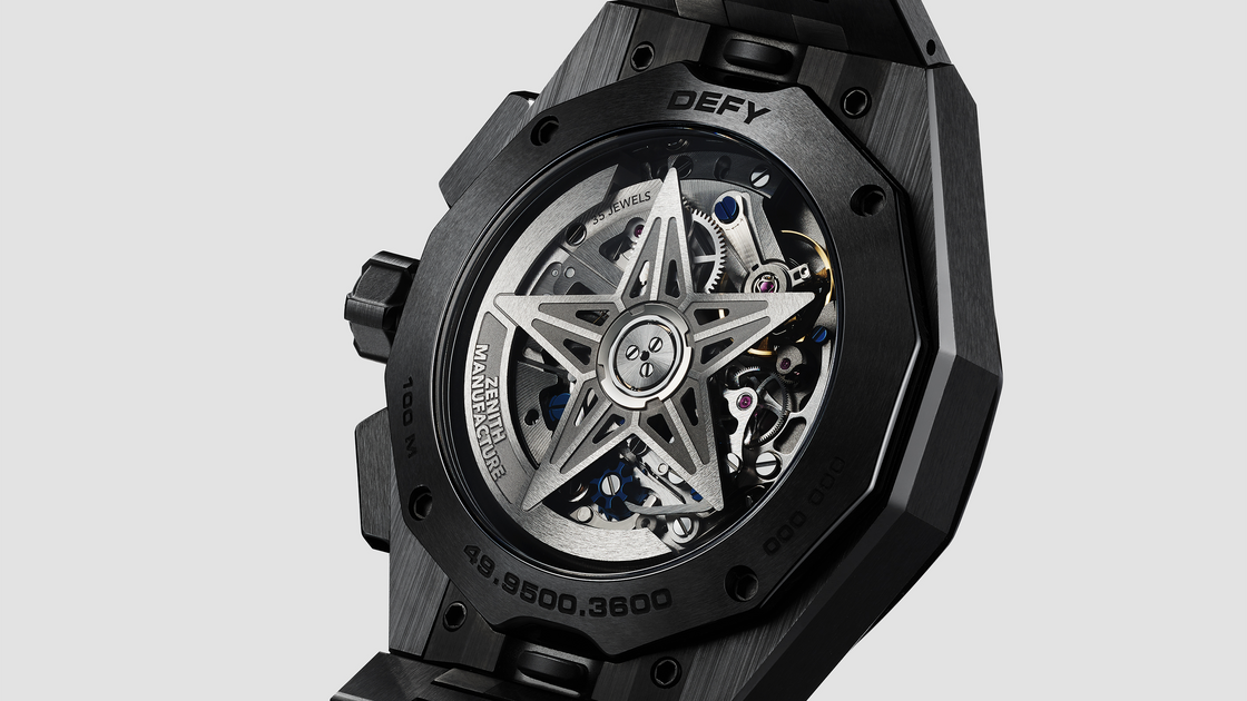キャリバーをその深部まであらわにしたタイムピースは、光と奥行き、均整のとれた機構が息づく構造の内部へと視線をいざないます。従来の文字盤ではヴェールに覆われていたパートが排され、時計の構造がそぎ落とされたピュアな姿で目の前に現れます。中央に浮かぶムーブメントは、機械仕掛けのスカイラインを彷彿とさせます。ムーブメントにとって唯一の支柱となる縁のフランジはアワーマーカーがセットされ、空間によりいっそうの深みをもたらしています。ゼニスのロゴはキャリバーの上を浮遊するかのようにサファイアクリスタル上にあしらわれています。機構の幾何学形状にも取り入れられているアイコニックなスターは、スケルトン化された地板にセットされています。