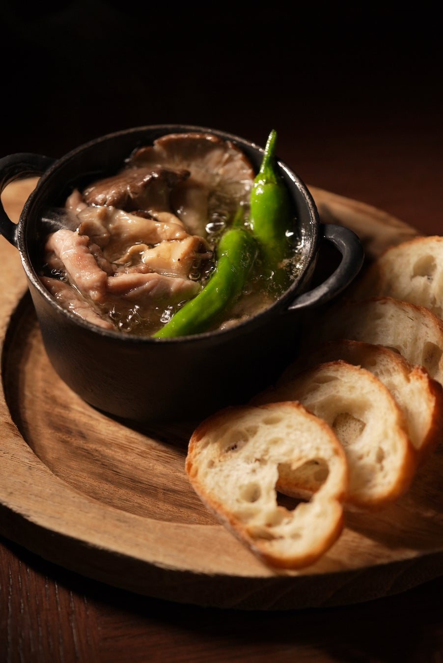 ぐつぐつと煮えたぎるココットが運ばれてくるとほのかな炭の香り。プリプリのせせりに獅子唐やきのこなどの季節の野菜がたっぷり入ったアヒージョ、付け合せのバゲットも旨味が溶け出したオイルをたっぷりと染み込ませてお召し上がりください。