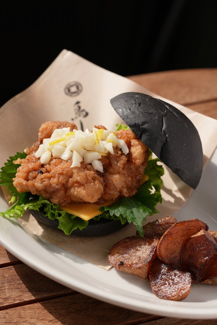 生地に墨を練り込んだアイコニックな真っ黒のバンズにしっかりと下味のついたフライドチキンとアメリカンチーズにゆず大根タルタルソース。付け合せには山椒ローストポテトをご用意しています。
