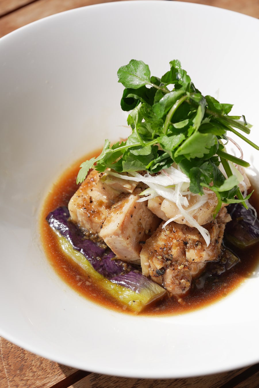 なすの揚げ浸しの上にぷりぷりに蒸した鶏のもも肉をのせ、