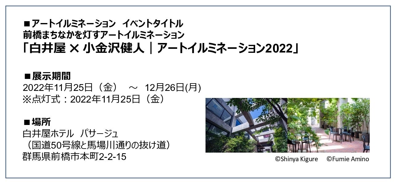 前橋のアートデスティネーション「白井屋ホテル」(2020年12月開業)を運営する白井屋ホテル株式会社(群馬県前橋市本町、代表取締役:矢村功)は、「前橋のまちなかをアートで明るく灯したい!」という思いでホテルの1周年を記念し、昨年2021年12月に鬼頭健吾氏の作品を展示し、白井屋アートイルミネーションをスタートしました。2回目となる今年は、11月25日(金)から12月26日(月)の開催を予定し、ベルリンをはじめ、世界中でさまざまなアートプロジェクトを手がけている小金沢健人(こがねざわたけひと)氏を迎え、まちなかを灯すアートイルミネーションを制作していただきます。群馬でも展覧会を何度も開催している小金沢氏の今回の白井屋でのアートイルミネーションは、群馬のアートシーンを牽引するrin art association原田崇人(はらだたかひと)氏がディレクションを担います。