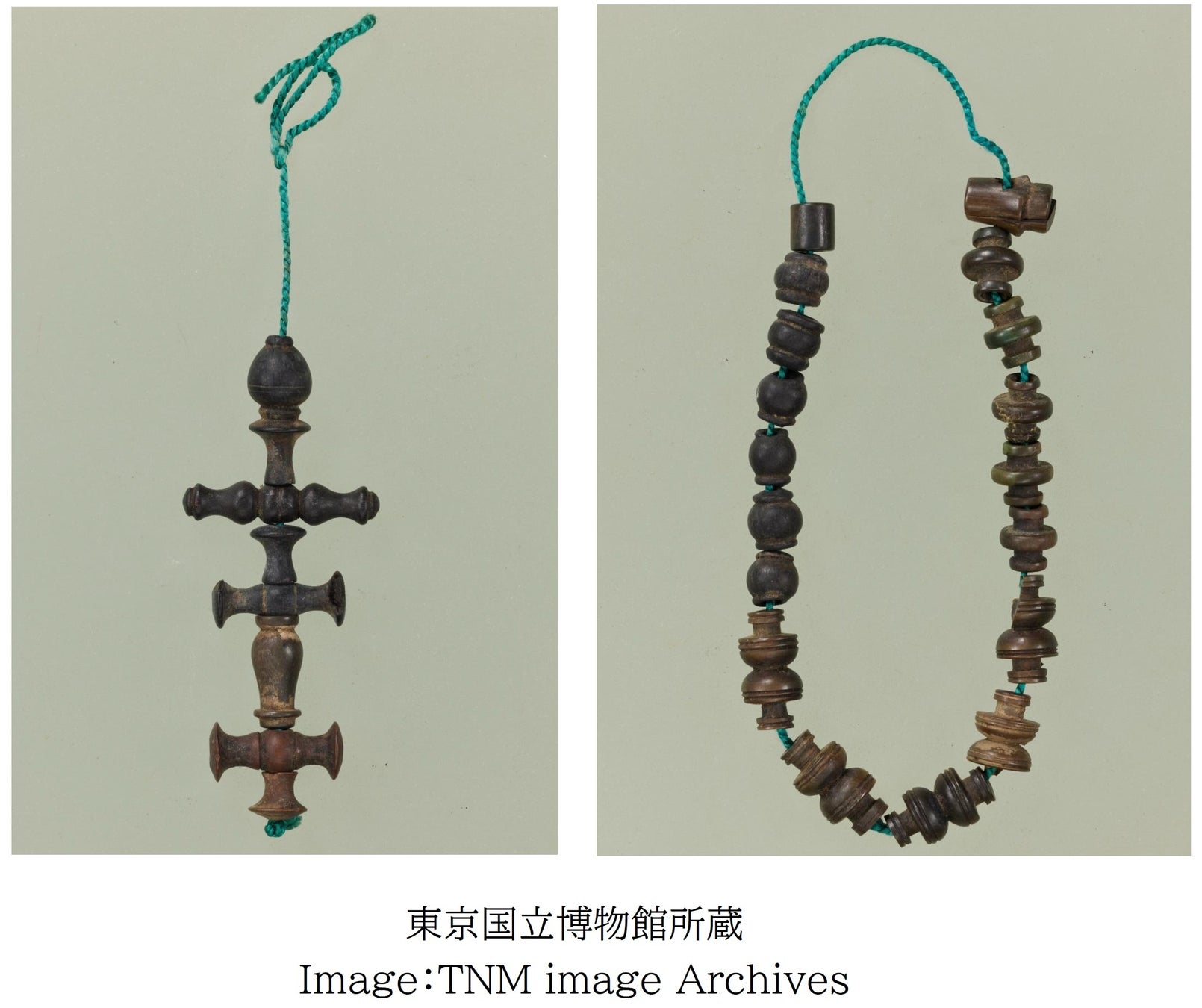 福知山城から出土した「ロザリオ※」で、禁教令以降近隣の身分ある信徒が福知山城に埋めて隠したものと推測される。関ケ原の戦い時福知山城主であった小野木重次の妻はキリシタンとされキリスト教との関連が伺える。