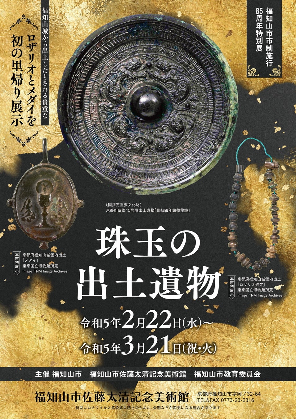 京都府福知山市は、福知山市市制施行85周年を記念して、福知山城から出土した16世紀~17世紀のキリシタン関連のロザリオ6連とメダイ5種6点(東京国立博物館所蔵)や、1990年に重要文化財に指定後、本市初公開となる「景初四年銘盤龍鏡」を展示。その他、府指定文化財「草創期縄文土器深鉢(そうそうきじょうもんどきふかばち)」など、福知山市が誇る「珠玉の出土遺物」を、2023年2月22日(水)~2023年3月21日(火・祝)の期間に福知山市佐藤太清記念美術館で一挙公開します。