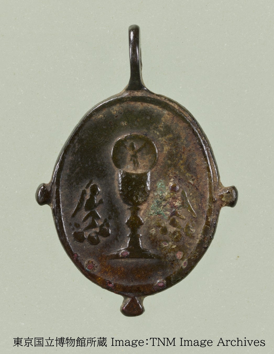 福知山城から出土した「メダイ※」で、禁教令以降近隣の身分ある信徒が福知山城に埋めて隠したものと推測される。図様は国の重要文化財「天草四郎陣中旗」にも描かれている「天使の聖体礼拝」。