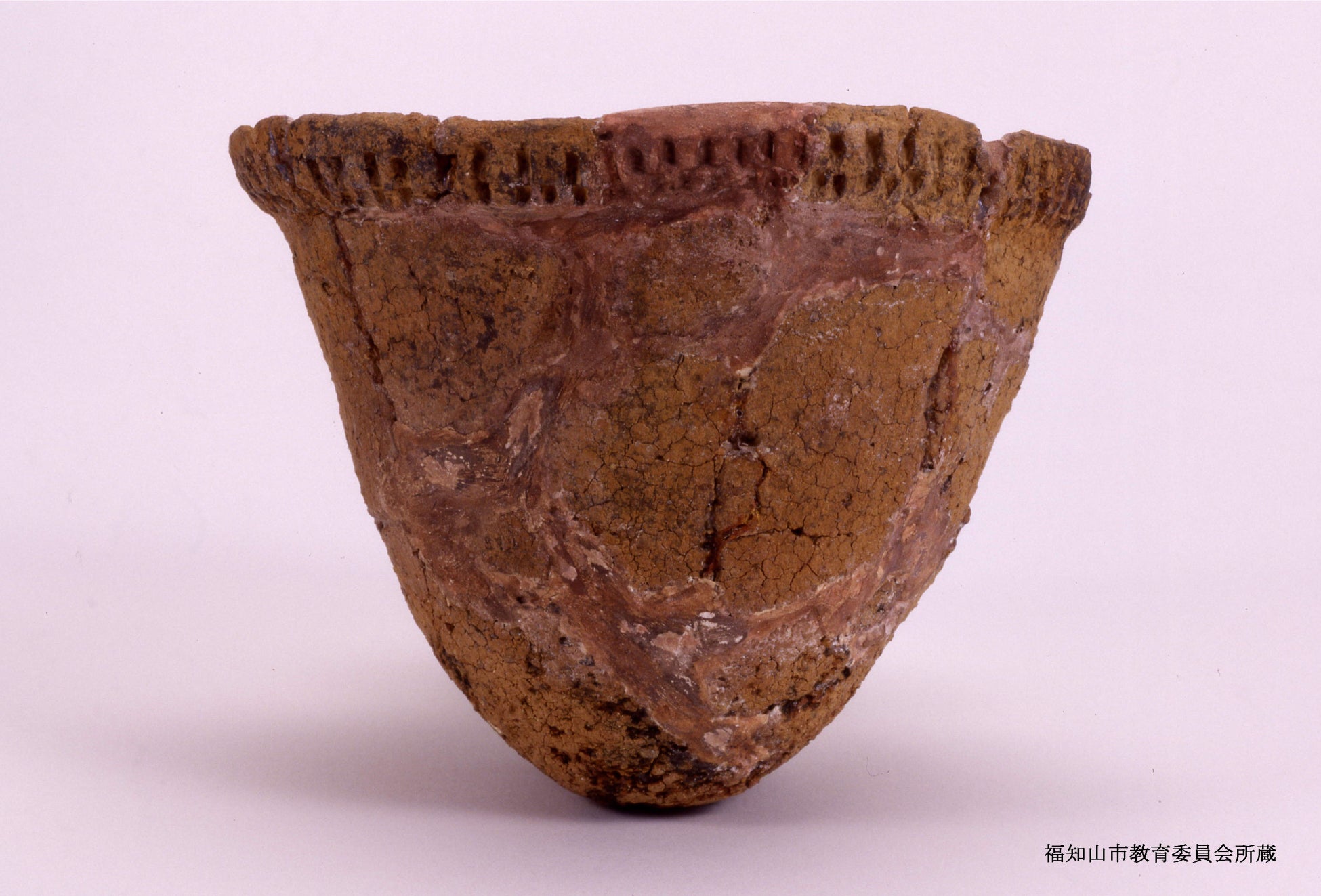 福知山市堀の武者ヶ谷遺跡から出土した、約15,000年前の縄文時代草創期の刺突文(しとつもん)小型丸底土器。近畿地方でも最古級のものとされ極めて貴重な出土遺物です。