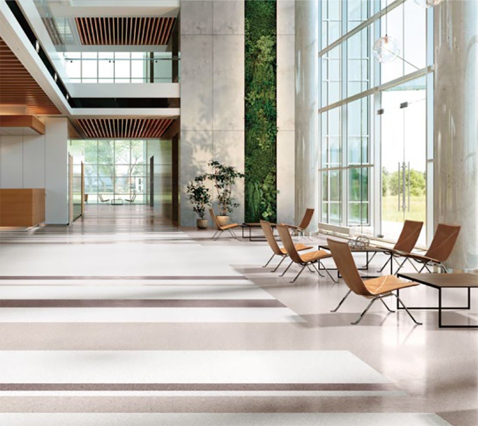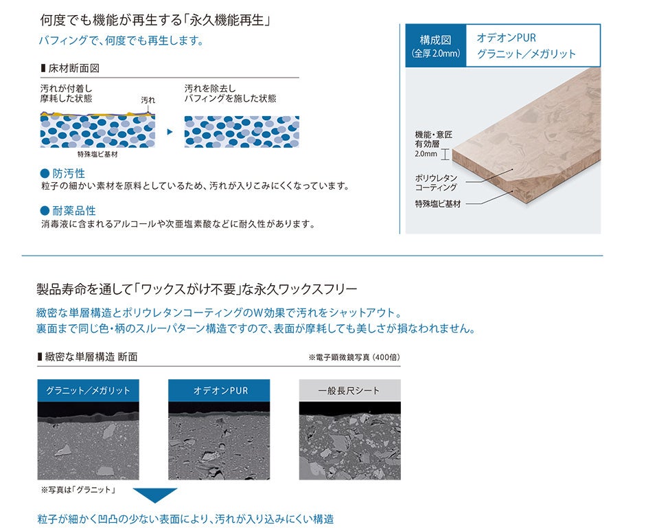 単層シート(オデオンPUR/グラニット/メガリット)は、裏面まで同じ色・柄の単層構造により、表面が摩耗しても美しさが損なわれず、耐動荷重性や耐薬品性にも優れた高機能商品です。「永久機能再生」による商品寿命の長さと、「永久ワックスフリー」により大量の汚水が発生するワックス剥離作業が不要なため、環境負荷低減に貢献します。新見本帳では、このエコでサステイナブルな機能を持つ単層シートを刷新しました。