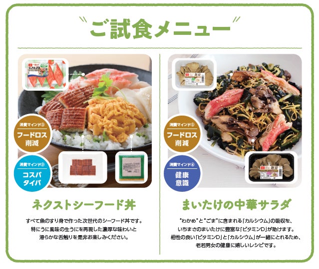 会期中は、試食を通して多くの方においしさだけでなく、当社の環境配慮や健康増進への取組みや、消費マインドをつかんだエシカルな売場提案を紹介いたします。