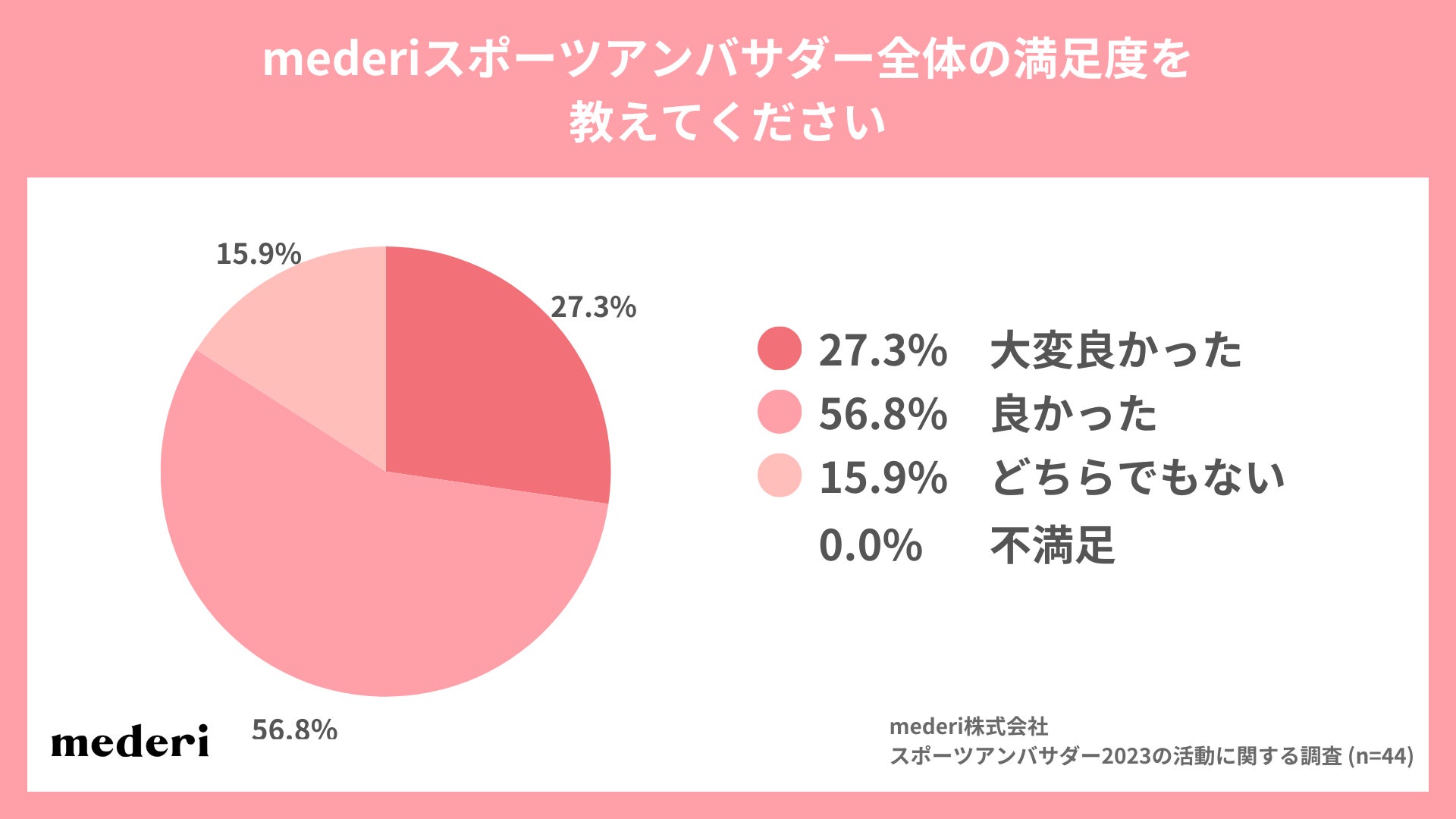 mederiスポーツアンバサダー全体の満足度については、「大変良かった(27.3%)」「良かった(56.8%)」 と回答した人が8割以上。