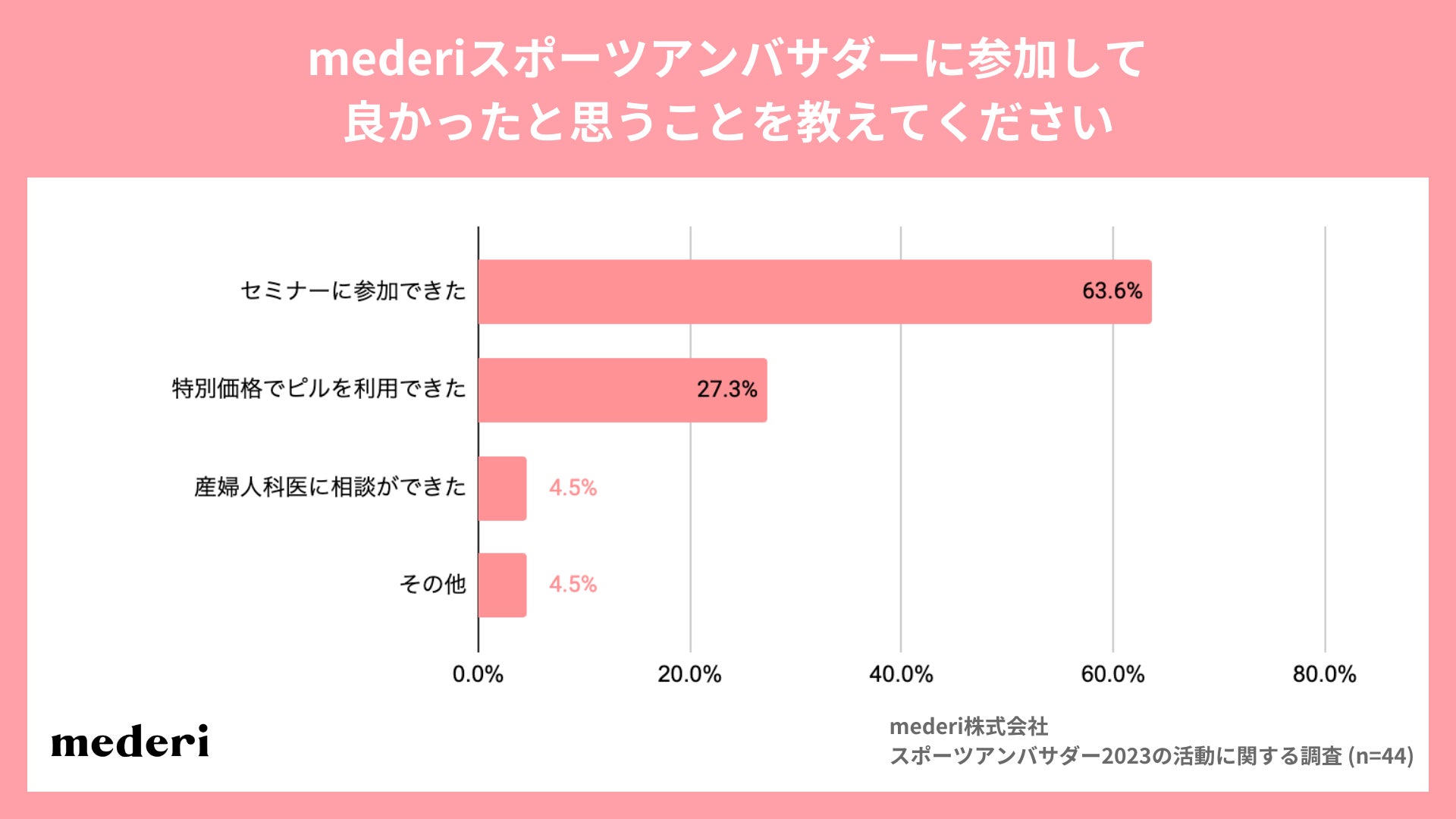 mederiスポーツアンバサダー全体の満足度については、「大変良かった(27.3%)」「良かった(56.8%)」 と回答した人が8割以上となり、全体的に満足度が高い結果となりました。特にmederiスポーツアンバサダーに参加した中で良かったことについては、「セミナーに参加できた(63.6%)」が最も多く、次いで「特別価格でピルを利用できた(27.3%)」が多い結果に。