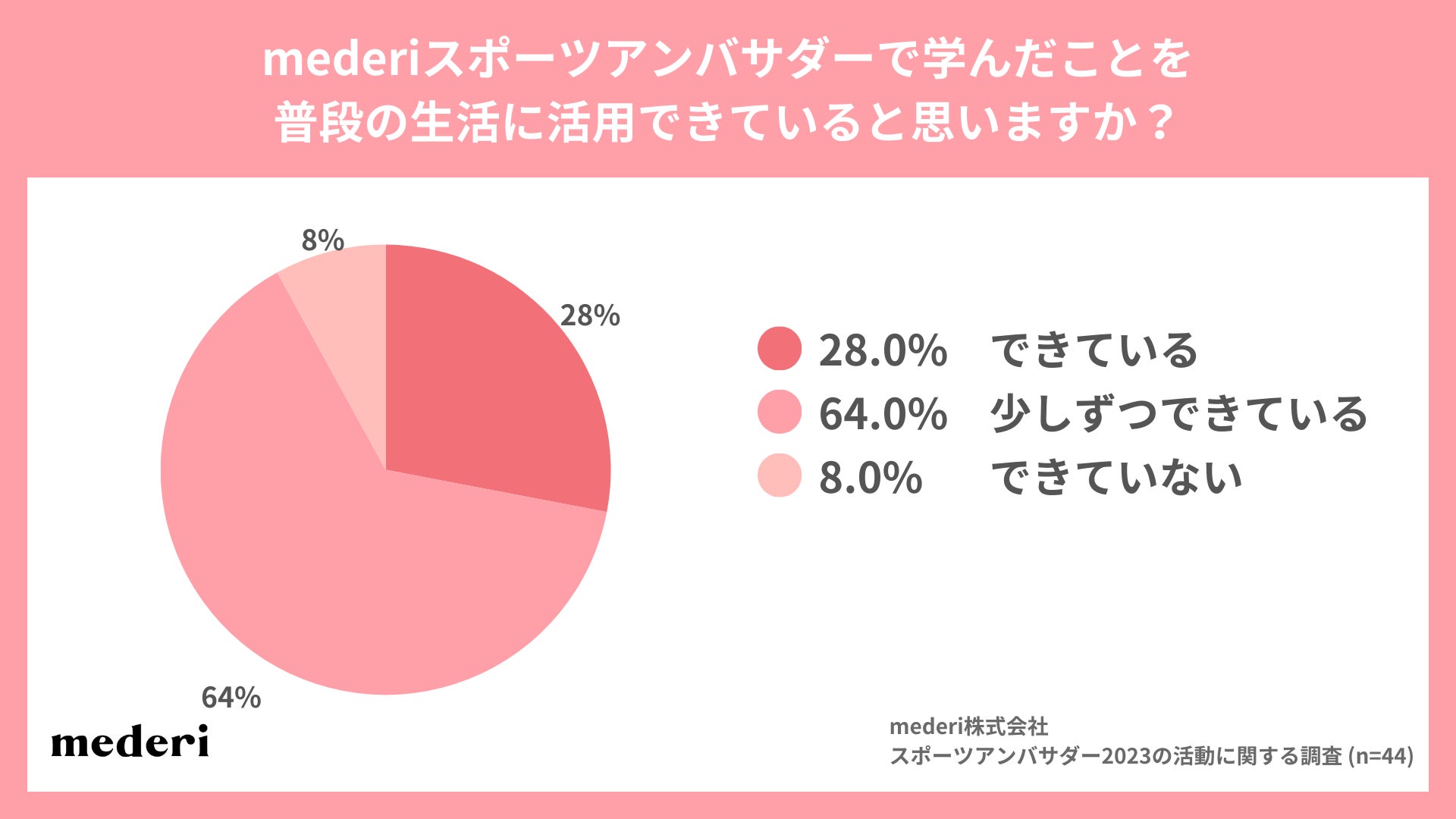 さらに「mederiスポーツアンバサダーで学んだことを普段の生活に活用できていると思いますか?」という設問には「できている(28%)」「少しずつできている(64%)」と回答した人が合わせて9割以上の結果に。