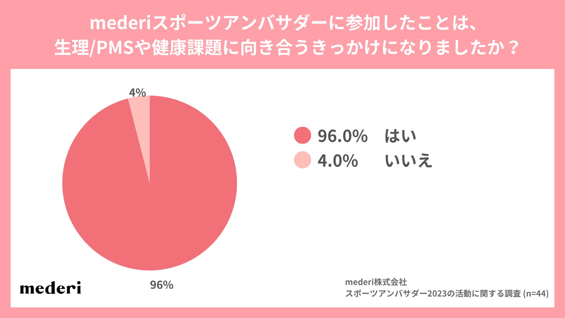 また、mederiスポーツアンバサダーに参加したことは生理/PMSや健康課題に向き合うきっかけになったかについては、「はい(96%)」と回答した人が9割以上となりました。