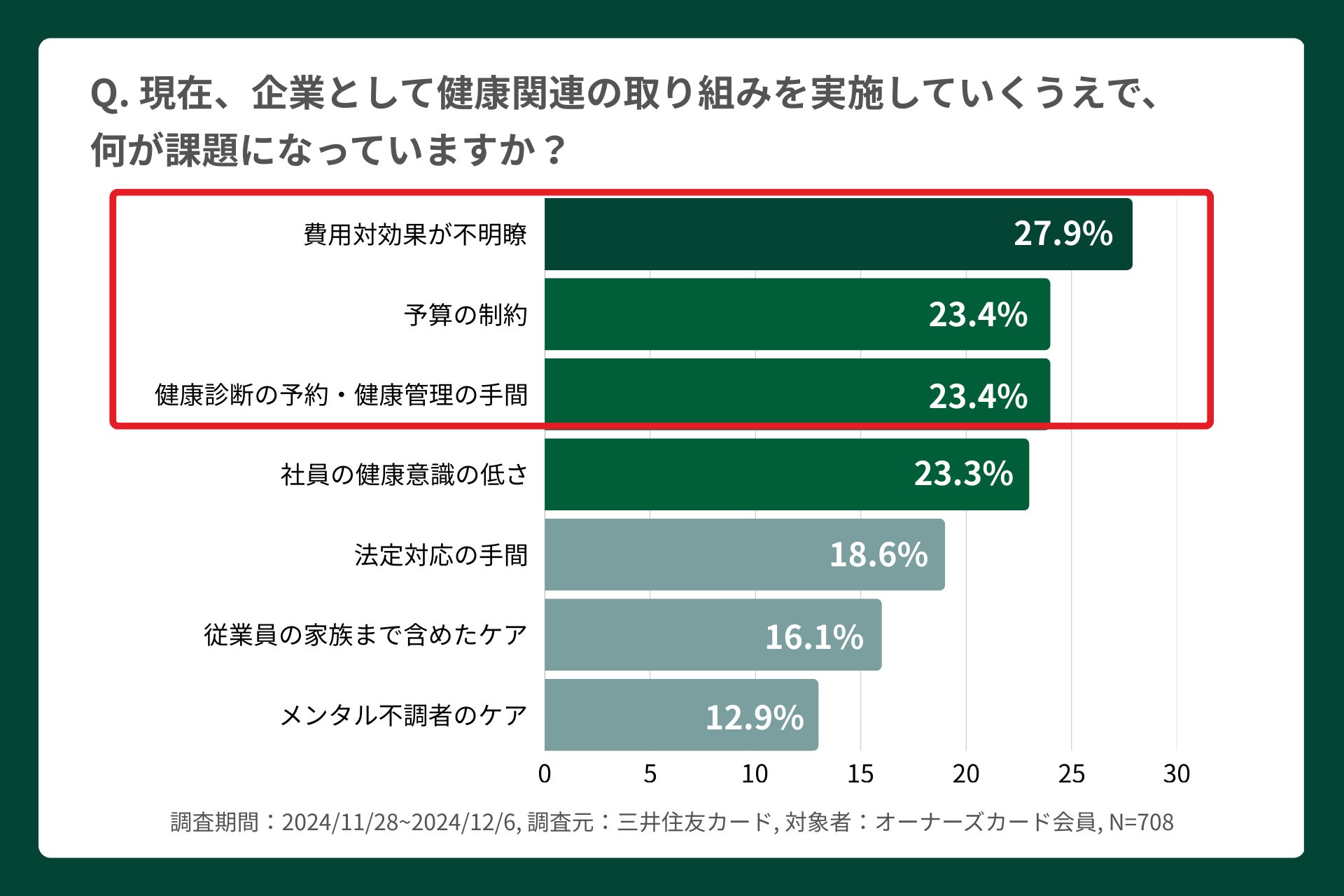 一方で、三井住友カードとヘルスケアテクノロジーズが、三井住友カードの法人カードをご利用いただいている企業を対象に実施した健康関連アンケート調査で、企業は取り組みを実施するうえで「費用対効果が不明瞭」「予算の制約」「管理の手間」等の課題を抱えていることが見えてまいりました。