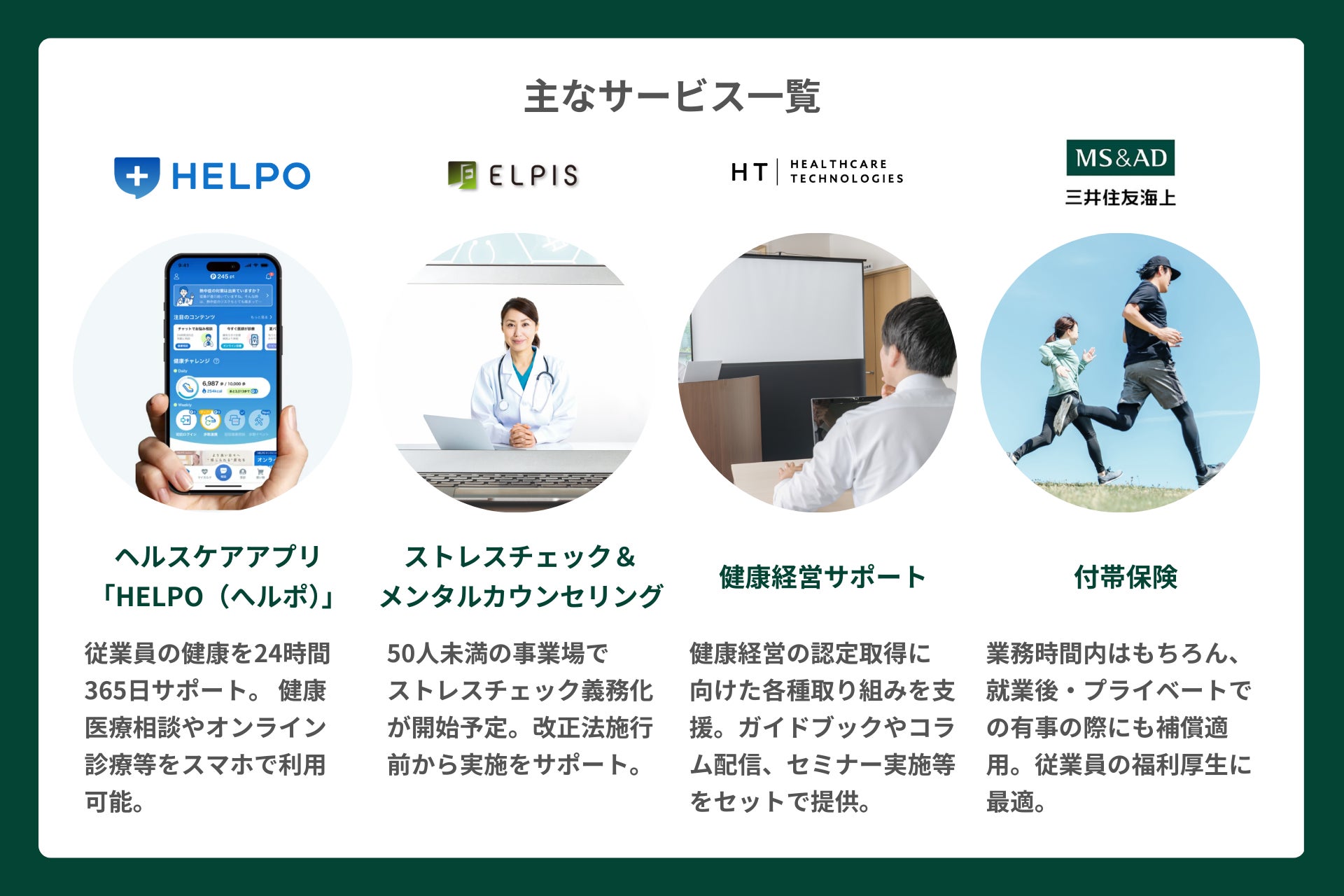 本パッケージでは、ヘルスケアテクノロジーズが提供するヘルスケアアプリ「HELPO(へルポ)」をはじめとした健康経営に資するサービスを複数組み合わせ、三井住友カードのオーナーズカードをご利用の企業向けに、導入しやすいパッケージとして開発いたしました。
