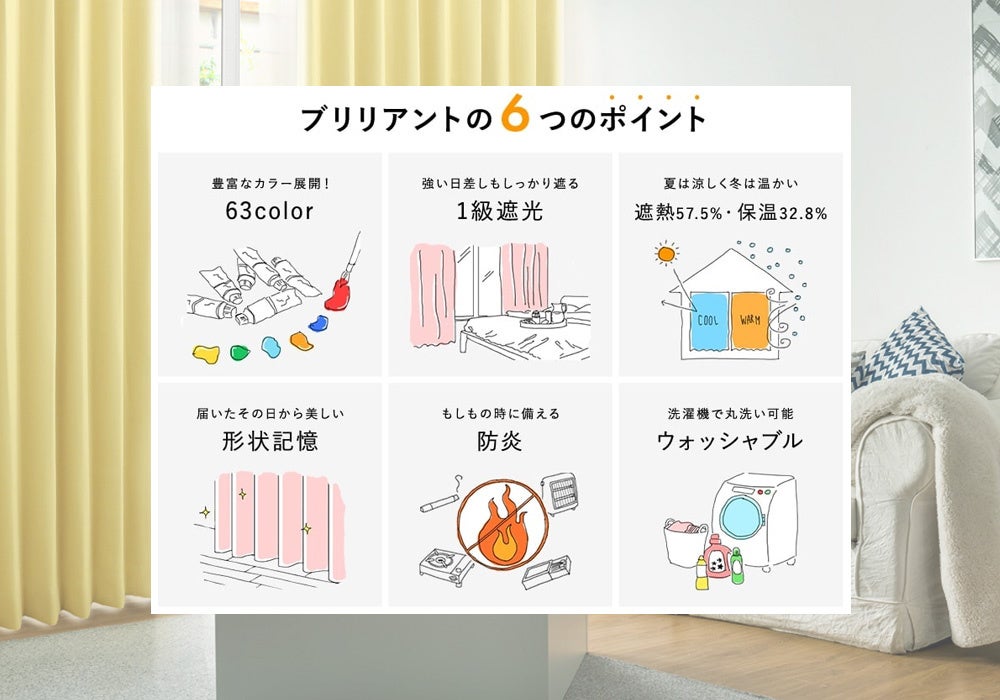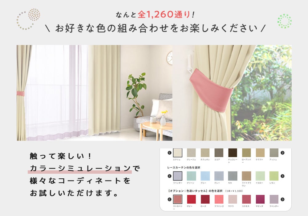1級遮光カーテン「ブリリアント」63色と人気のミラーレースカーテン「セゾン」20色から、お好きな色をお選びいただけるカラーコーディネートセットです。全1,260通り、オプションの色違いタッセルも含めると全79,380通りから、自分だけのカラーコーディネートをお選びいただけます。