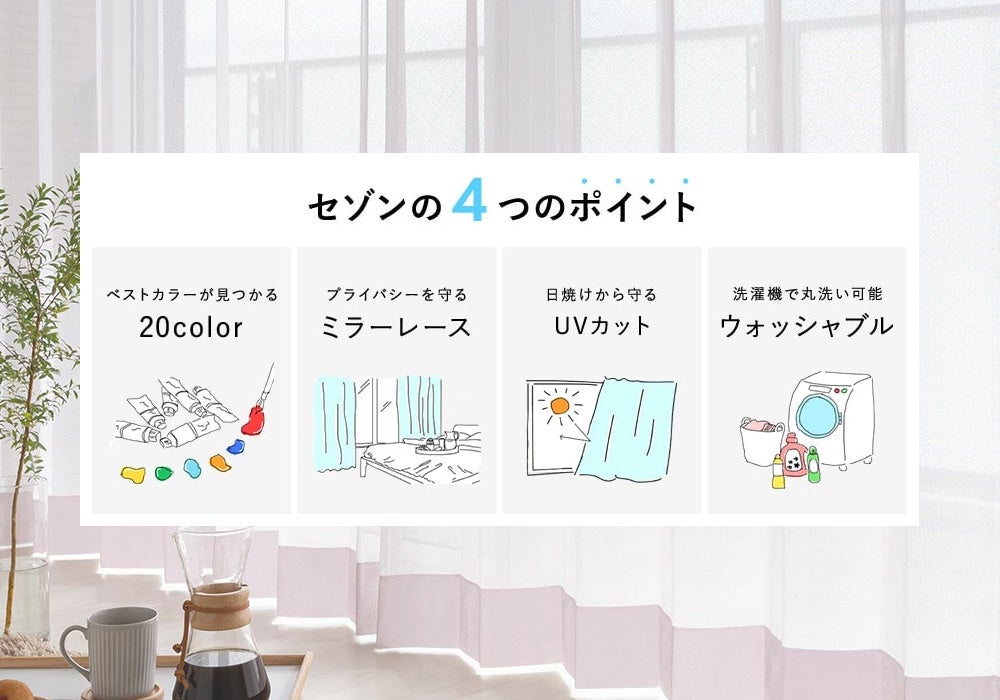 当店最安値(※)、売上No.1のミラーレースカーテンです。20色の豊富なカラーバリエーションからお選びいただけます。ロープライスにこだわりながらも、昼透けにくいミラー効果・UVカット・洗濯可とレースカーテンの定番機能はしっかりと網羅したこだわりの逸品です。(※アウトレット商品を除く)