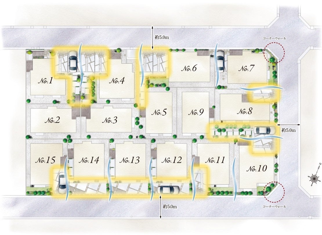 街区を包む幅員約5mの三方道路は、穏やかな陽光とさわやかな風を招き、コンセプトの「THE CULMINATION 上質を超える銘作を標す」にはいつまでも変わらぬ心地良い暮らしの実現をという願いを込めました。
