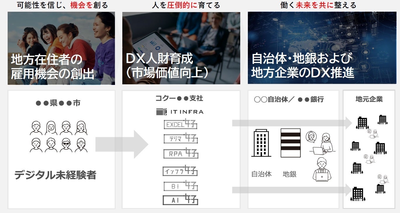 地方で大きな課題となっている労働人口減による人手不足の問題を解決するために、地元のデジタル未経験者をコクーの正社員として雇用、DX人財として育成し、地元企業のDX推進を支援するエコシステムをその地域につくることを目指します。これにより、雇用機会の創出、地域による給与格差の解消、地方自治体や地元企業のDX化を実現し「魅力ある職場や仕事」を地域につくりだすことで、人材流出の抑制と地域の活性化に貢献してまいります。
