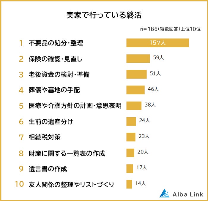 続いて、実家で終活をしていると回答した186人に、具体的にどのような終活を行っているかを聞きました。
