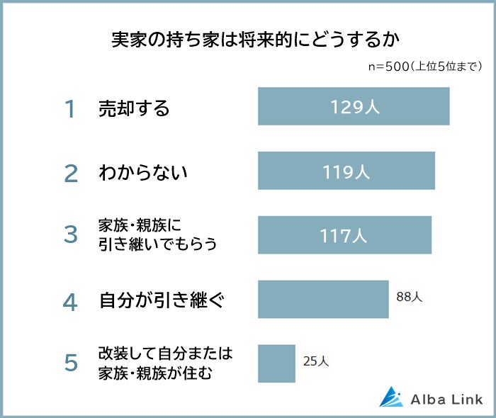 最後に、実家が持ち家の500人に「実家を将来的にどうするか」を聞きました。その結果、1位は「売却する(129人)」、僅差の2位は「わからない(119人)」、3位は「家族・親族に引き継いでもらう(117人)」でした。
