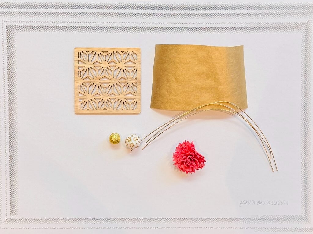 内容:アートキット(ベース用木製プレート、デコレーション素材[ハンドメイドフラワー、水引、縮緬ボール、以下「素材」])、作り方を記載した紙、敷き物)