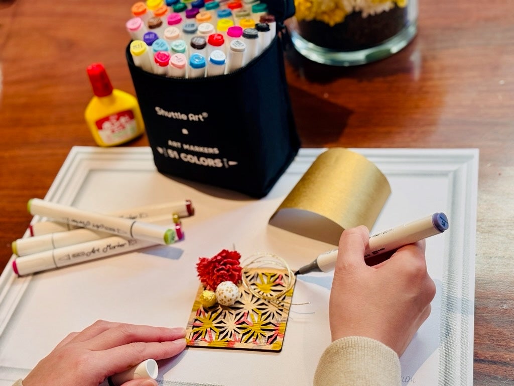 ハンドメイドフラワーや装飾をつけるベースとなるプレートは用意されているので、デコレーション用の素材をじっくりと眺めることから始まります。素材の表情を楽しみながら、プレートにつけ、色を塗り仕上げます。コースターや壁飾り、置物など、どのように表現するかは作り手次第です。