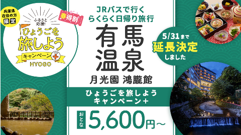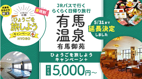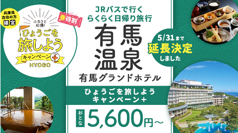 【5月31日迄延長!兵庫県民限定!】有馬温泉でゆっくり癒しの旅特集!!5,000円で往復JRバスで行く豪華な昼食付日帰り入浴or13,000円で1泊2食の宿泊プランあなたはどっち!!