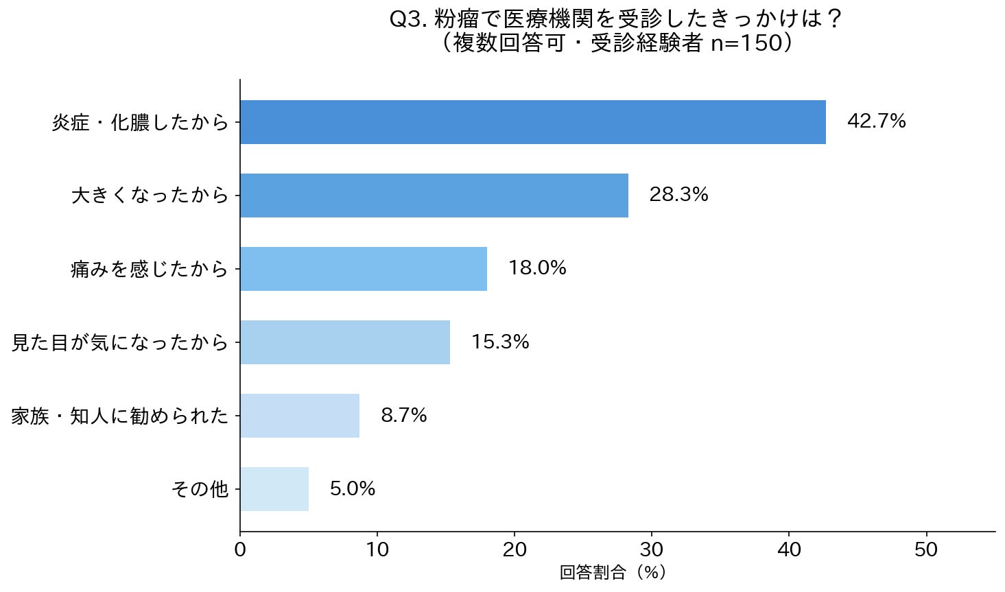 粉瘤で医療機関を受診した経験がある150名に対し、受診のきっかけを調査しました(複数回答可)。最も多かったのは「炎症・化膿したから」で42.7%、次いで「大きくなったから」が28.3%、「痛みを感じたから」が18.0%という結果になりました。症状が悪化してから受診する傾向が見られ、早期受診の意識が低いことが浮き彫りになりました。