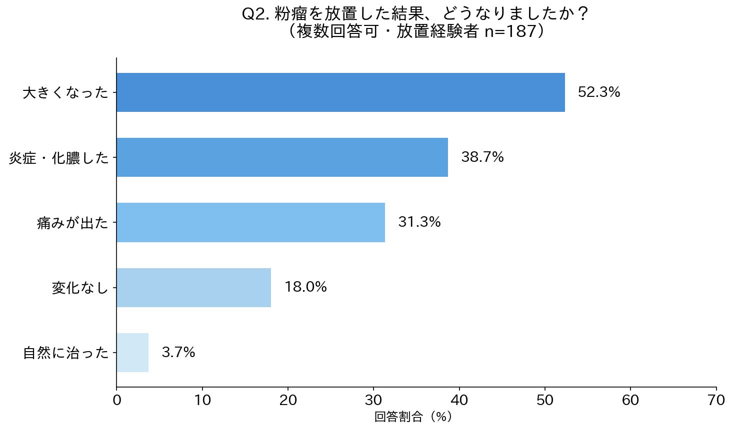 粉瘤を放置した経験がある187名に対し、その結果どうなったか調査しました(複数回答可)。最も多かったのは「大きくなった」で52.3%、次いで「炎症・化膿した」が38.7%、「痛みが出た」が31.3%という結果になりました。一方、「自然に治った」と回答した方はわずか3.7%にとどまり、粉瘤は放置しても自然に治らないことが改めて確認されました。