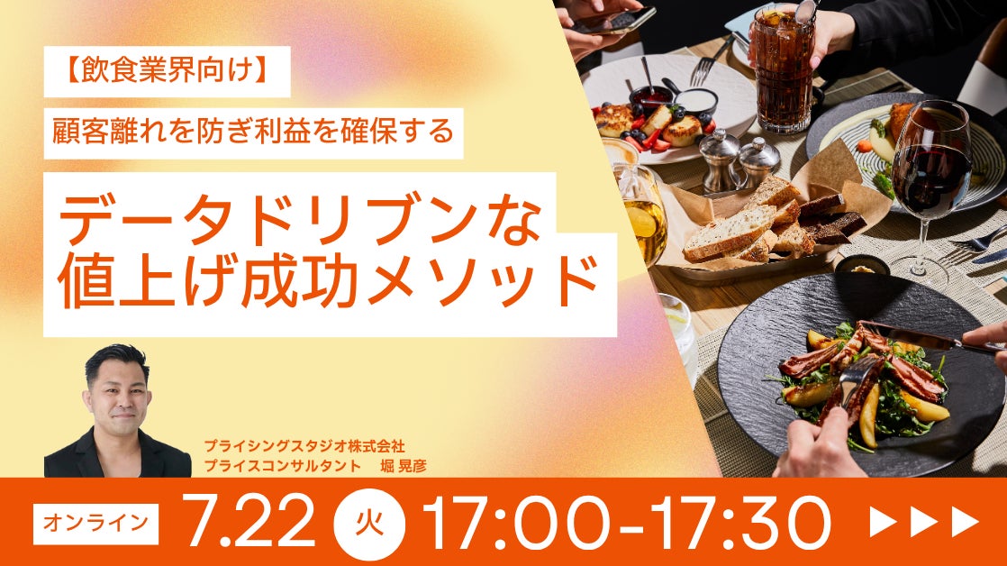 プライシングスタジオ株式会社(本社:東京都港区、代表取締役:高橋嘉尋)は、無料オンラインセミナー『【飲食業界向け】顧客離れを防ぎ利益を確保する、データドリブンな値上げ成功メソッド』を、7/22(火)17時に開催いたします。