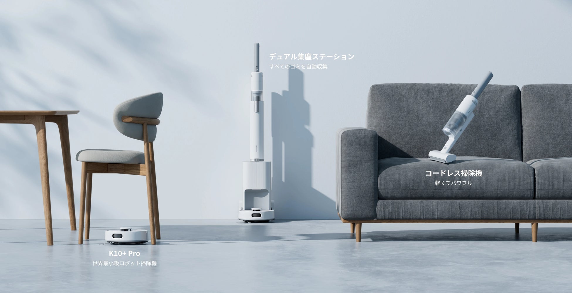 A4用紙サイズのわずかなスペースにすっぽり収まる集じんステーションには、直径24.8㎝で業界を震撼させたロボット掃除機K10+ Pro、そして軽量で扱いやすい元祖・お掃除道具であるスティック掃除機を収納。高い静音性、小回りの良さ、省スペース設計、メンテナンスのしやすさ、扱いやすさなど多くの点において、「どんな住宅でも、誰もが使いやすい」を軸に置いた配慮や工夫が施されています。