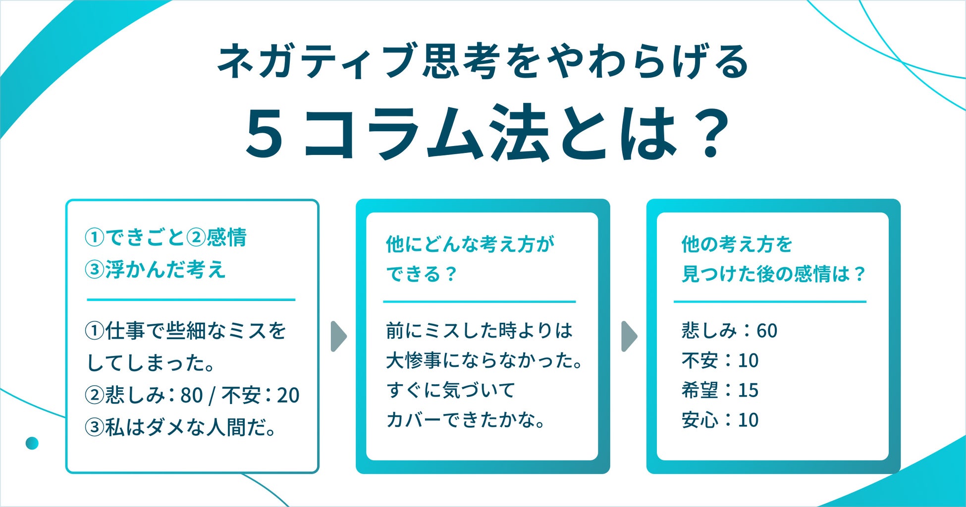 「モヤモヤや悩みのループから抜け出せない…。」その原因は、もしかすると”いつもの考え方のクセ”にあるかもしれません。5コラム法は、5つの質問で自分の”いつもの考え方”に気づき、”新しい考え”を取り入れる心理学のフレームワークです。ネガティブな感情を和らげるだけでなく、バランスの良い思考で、物事を柔軟に捉えられるようになります。