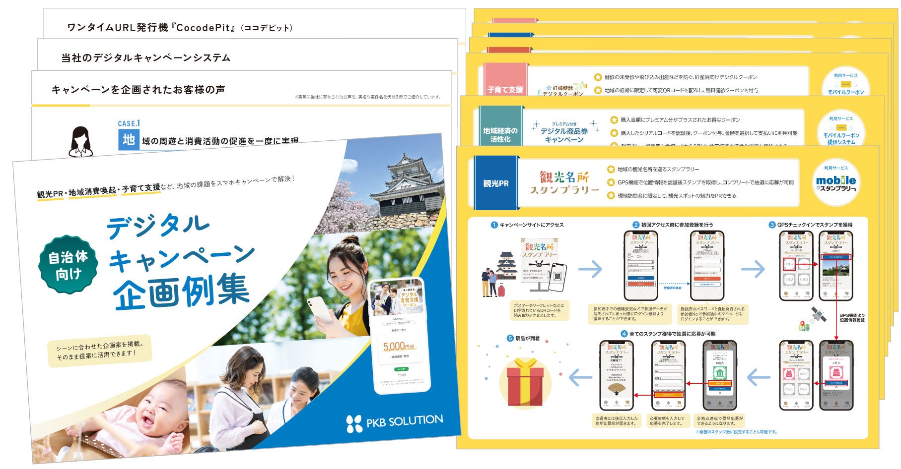 <資料内容> ・当社のデジタルキャンペーンシステムについて ・キャンペーンを企画されたお客様の声 ・企画例 【観光PR】観光名所スタンプラリー 【観光PR/地域経済の活性化】街ブラ クイズラリー 【地域経済の活性化/不正参加の防止】街ナカ スタンプラリー 【地域経済の活性化】プレミアム付きデジタル商品券キャンペーン 【子育て支援】妊婦健診デジタルクーポン 【子育て支援】子育て支援デジタルクーポン ・ワンタイムURL発行機『CocodePit』(ココデピット) |