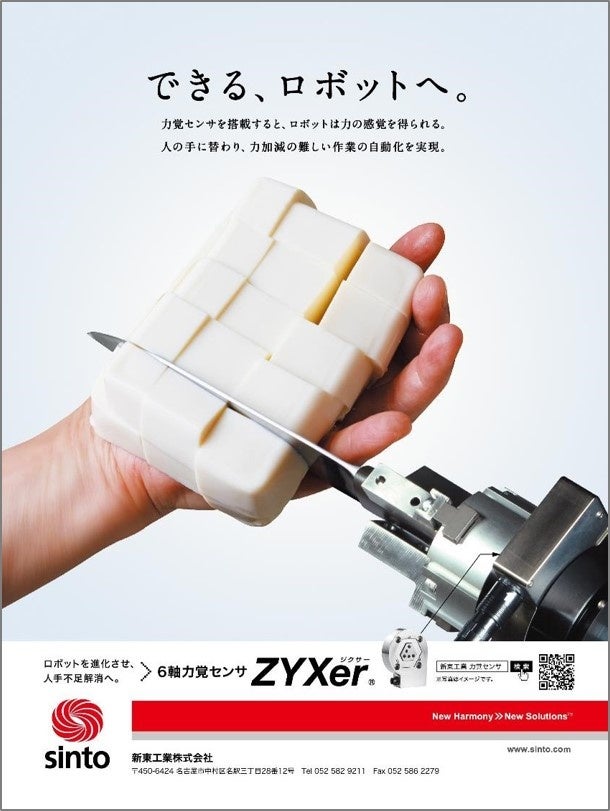 グランプリを受賞した広告は、当社製品「6軸力覚センサ(ZYXer ジクサー)」を搭載したロボットが手の平にのせた豆腐を包丁で切るといった、微妙な力加減を実現する力覚センサの特長をわかりやすいビジュアルで表現しました。