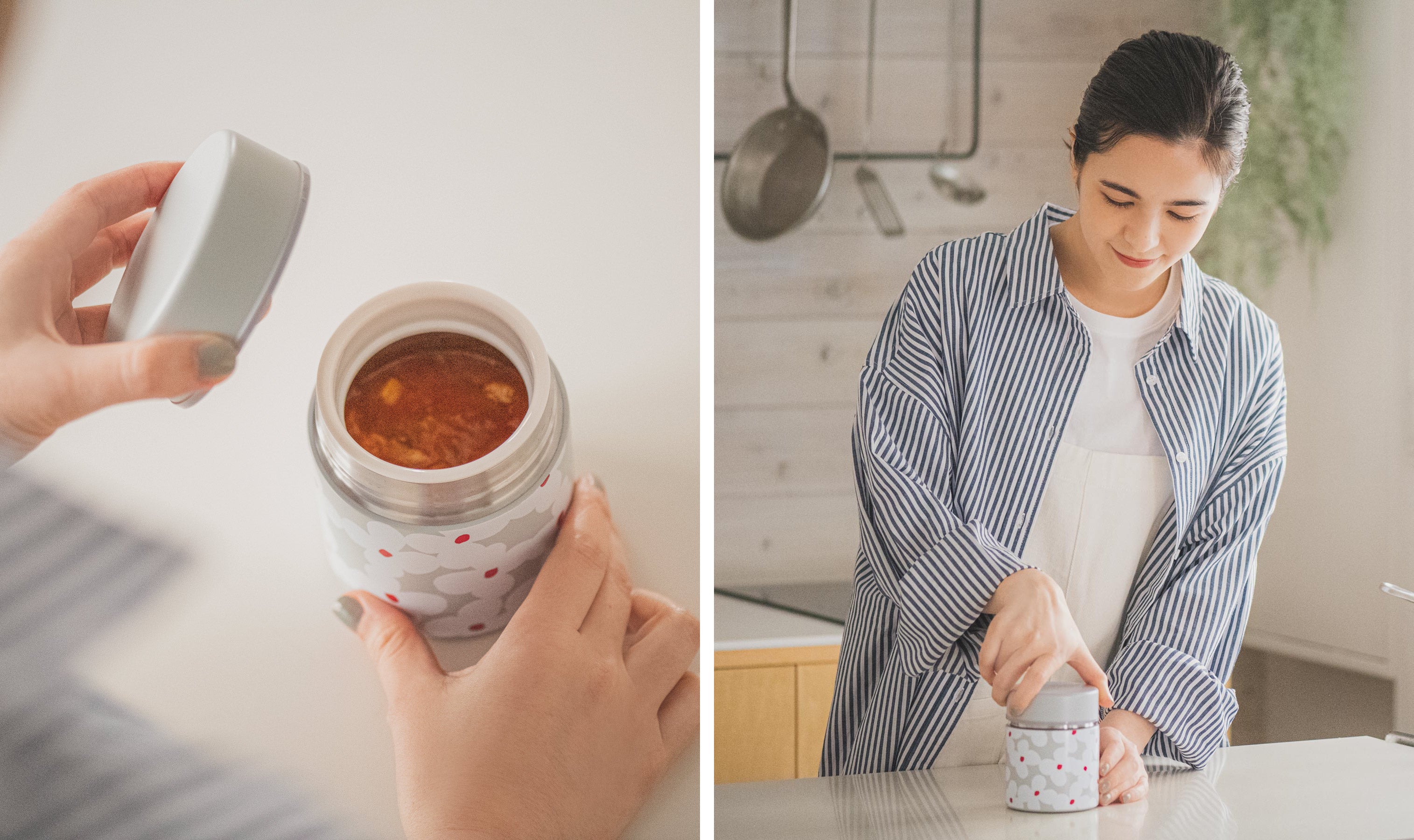 保温&保冷ができるスープジャーが登場。スープなどのおかずを温かいまま、美味しく食べられるのでこれからの季節に大活躍です。スープジャーと同じデザインのランチボックスやカトラリー、巾着、ステンレスボトルなどもご用意しているのでギフトとしても◎。