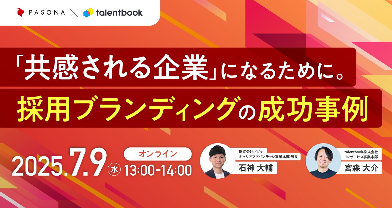 就活・転職活動に役立つキャリア学習サイト「talentbook」及び、法人向け採用マーケティング支援サービスを提供するtalentbook株式会社(本社:東京都渋谷区、共同代表取締役:大堀航・大堀海 以下、当社)は、2025年7月9日(月)に株式会社パソナ 石神大輔氏をお招きし「採用ブランディング」をテーマとしたオンラインイベントを開催いたします。