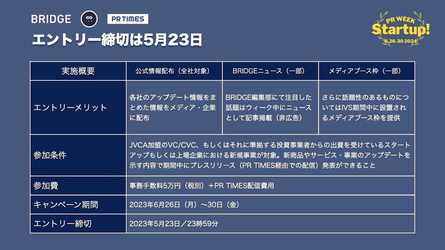 また、スタートアップメディア「BRIDGE」で各社の情報を取り上げるほか、期間中に京都で開催する日本最大級のスタートアップカンファレンス「IVS2023 KYOTO / IVS Crypto 2023 KYOTO」では、メディアブースなどの設置を通じて、オンライン・オフライン両面でスタートアップされるみなさんの情報流通に貢献いたします。