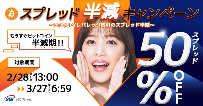 SBI VCトレード株式会社(本社:東京都港区、代表取締役社長:近藤 智彦、以下「当社」)は、2024年2月28日(水)より、「【もうすぐビットコイン半減期】BTC/JPYレバレッジ取引 スプレッド半減キャンペーン」を実施することをお知らせいたします。