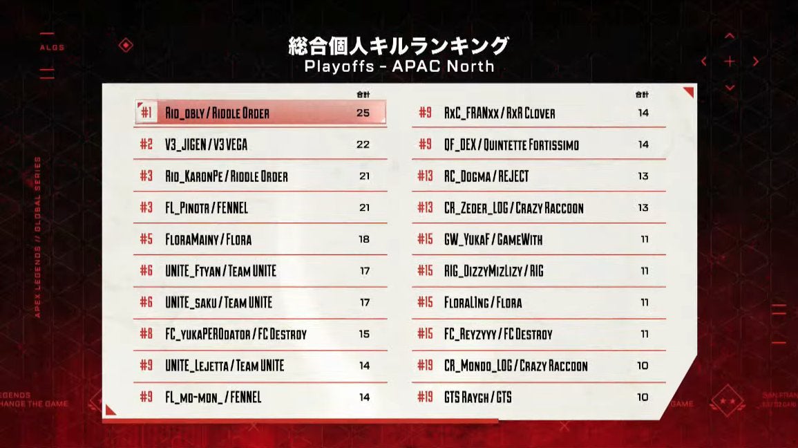 株式会社CyberZ、エイベックス・エンタテインメント株式会社、株式会社テレビ朝日が運営する国内最大級のeスポーツエンターテインメント「RAGE」は、エレクトロニック・アーツが主催するバトルロイヤルシューティングゲーム「Apex Legends」の世界大会「Apex Legends Global Series」の北アジア太平洋大会となる「Apex Legends Global Series:Pro League Split 1 Playoffs - APAC North」を2022年1月23日(日)に開催しました。実況の平岩康佑さん、解説のすでたきさん(ZETA DIVISION)が見守る中、優勝したのは韓国のRiddle Order。彼らはレギュラーシーズンで1位でしたが、それでも優勝までの道のりは平坦ではなく実力伯仲の展開が続いて決着は第10試合までもつれ込みました。そして7時間近い戦いを経て優勝した彼らには優勝賞金の10万ドル、また個人キル数最多プレイヤーに贈られるApex Predatorの称号を手にしたobly選手には賞金1500ドルが贈られました。