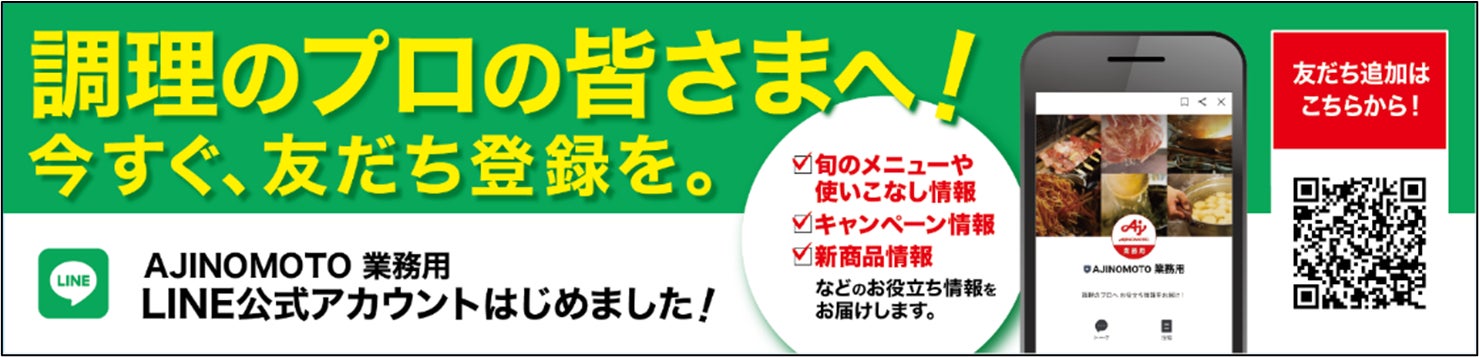 味の素KKではプロの皆さまに役立つ情報をお届けするためLINEの公式アカウントを開設いたしました。 季節のメニュー提案や調味料の活用術など業務に役立つ情報をお届けします。