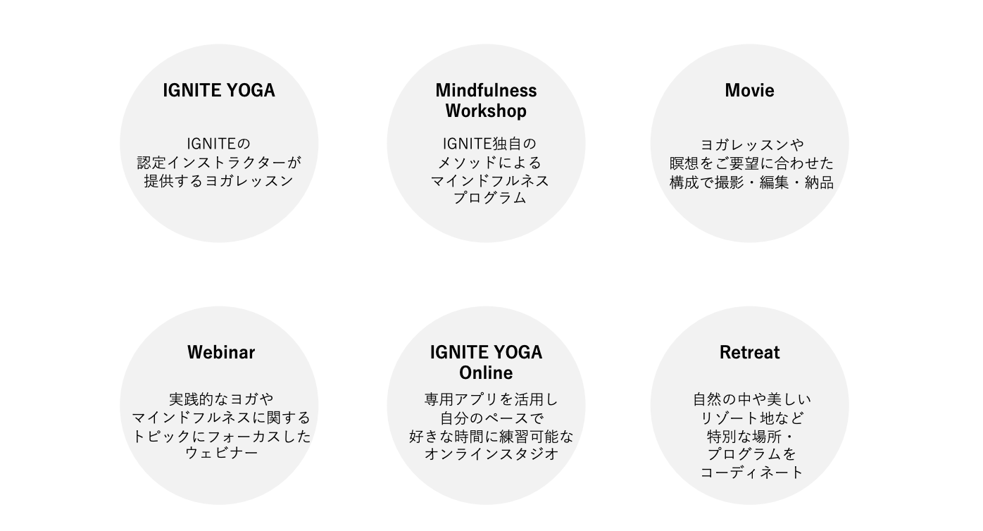 「IGNITE YOGA」のスタジオに通うお客様の“自身が所属する企業でもレッスンをして欲しい”というリクエストにより生まれた事業です。ぜひ昨今、注目されているウェルビーイング経営など、従業員の健康促進や社内コミュニケーションにお役立てください。