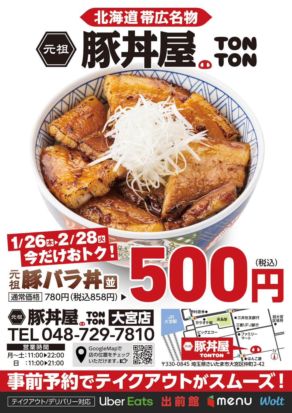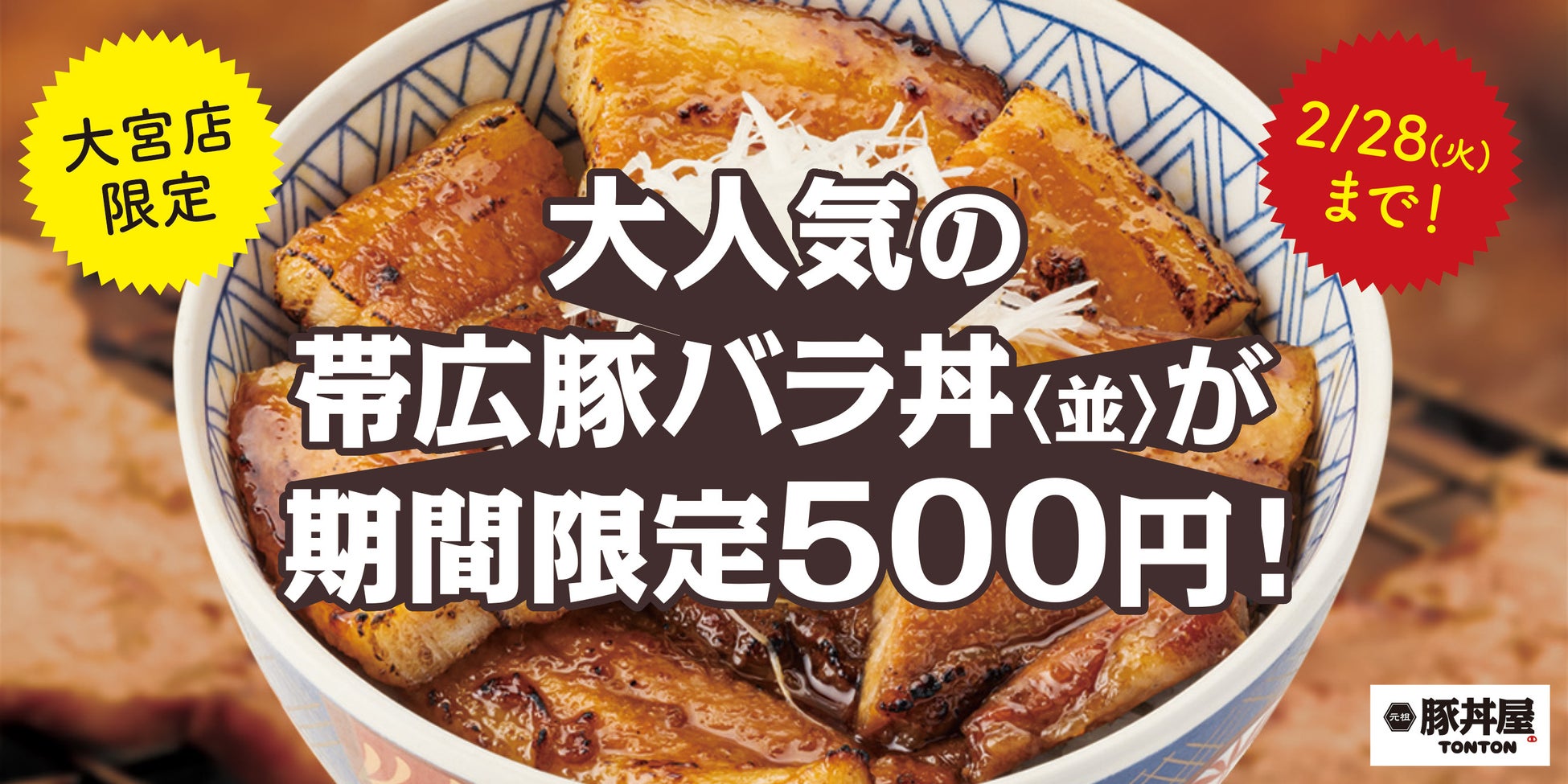 ボリュームたっぷりの北海道・帯広豚丼が人気の「元祖豚丼屋TONTON 大宮店」(住所:埼玉県さいたま市大宮区仲町2-42、TEL:048-729-7810)では、2月28(火)までの期間中「豚バラ丼【並】」を期間限定価格500円(税込)で提供しております。